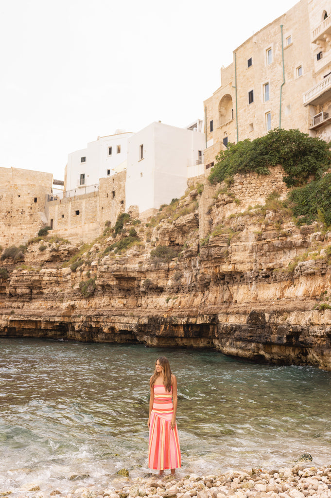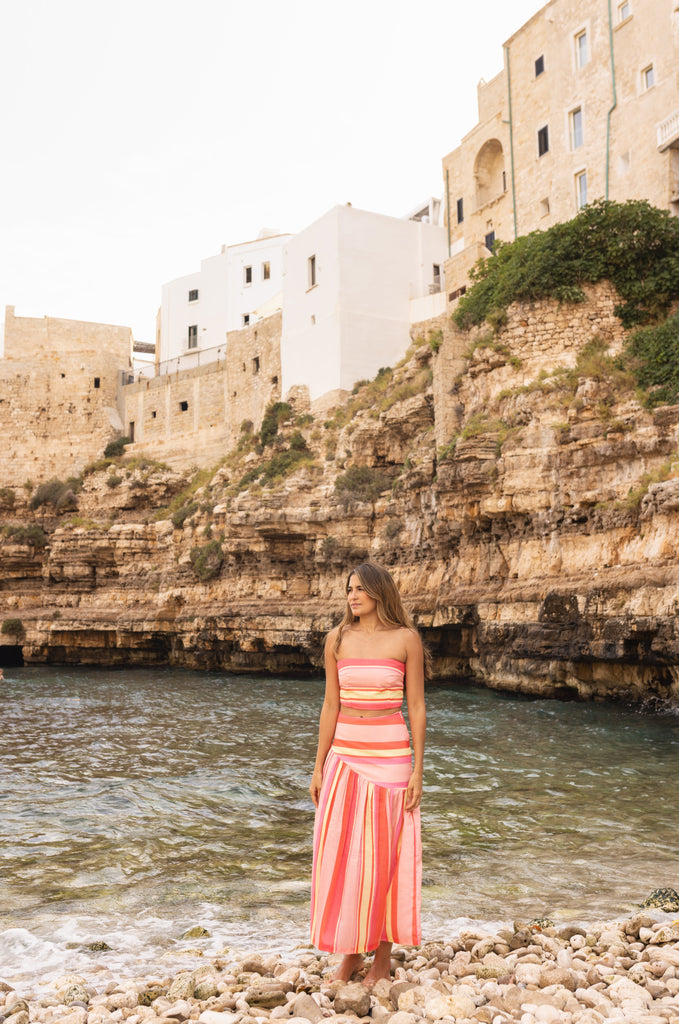 Falda midi con tiro alto, presenta una arandela tipo bolero asimétrica y divertida, tiene cremallera invisible. Su print está inspirado en las historias del pasado con patrones retro de la década de los setentas.