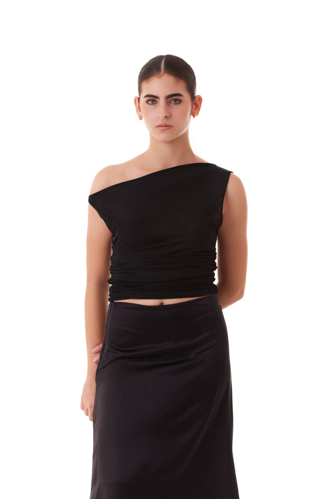 Top de malla suave y elástica, presenta escote bandeja con manga caída, costados fruncidos y largo clásico.